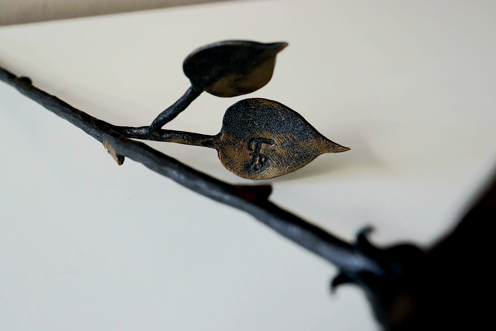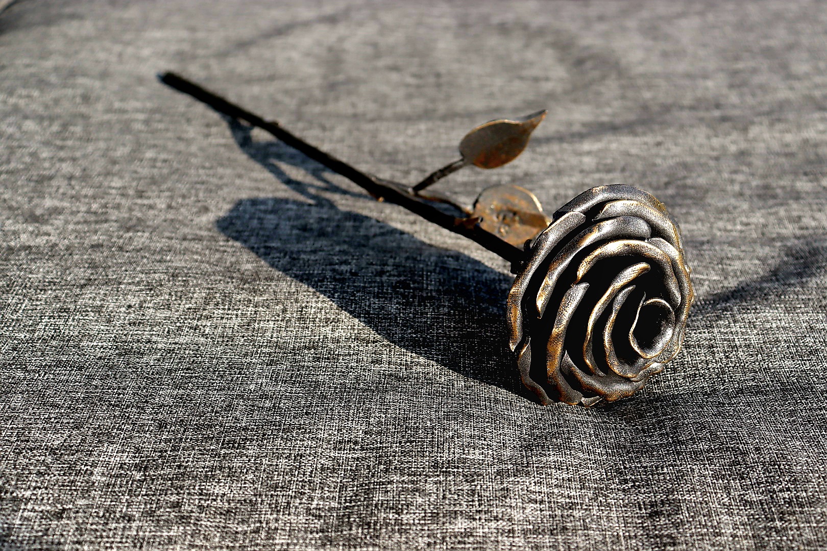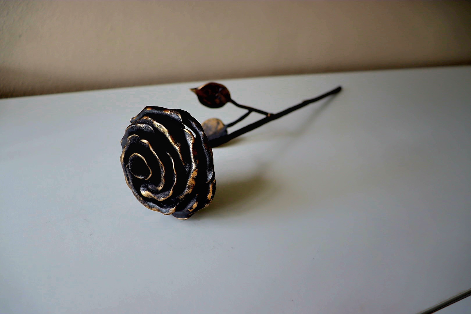 Ručně kovaná růže s tóny zlaté barvy včetně kovaných trnů.
