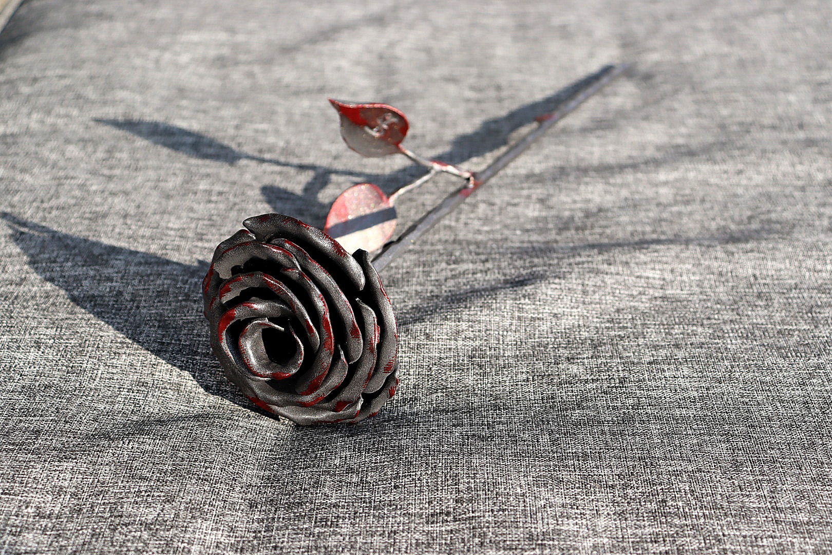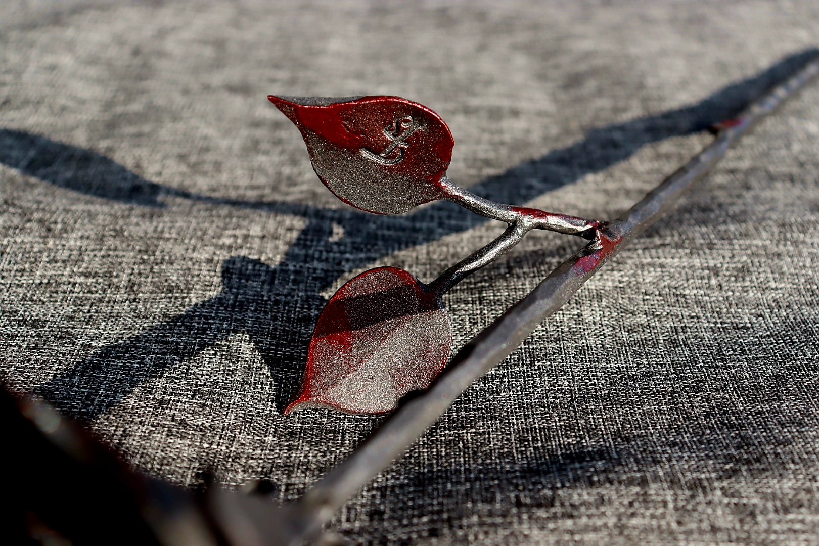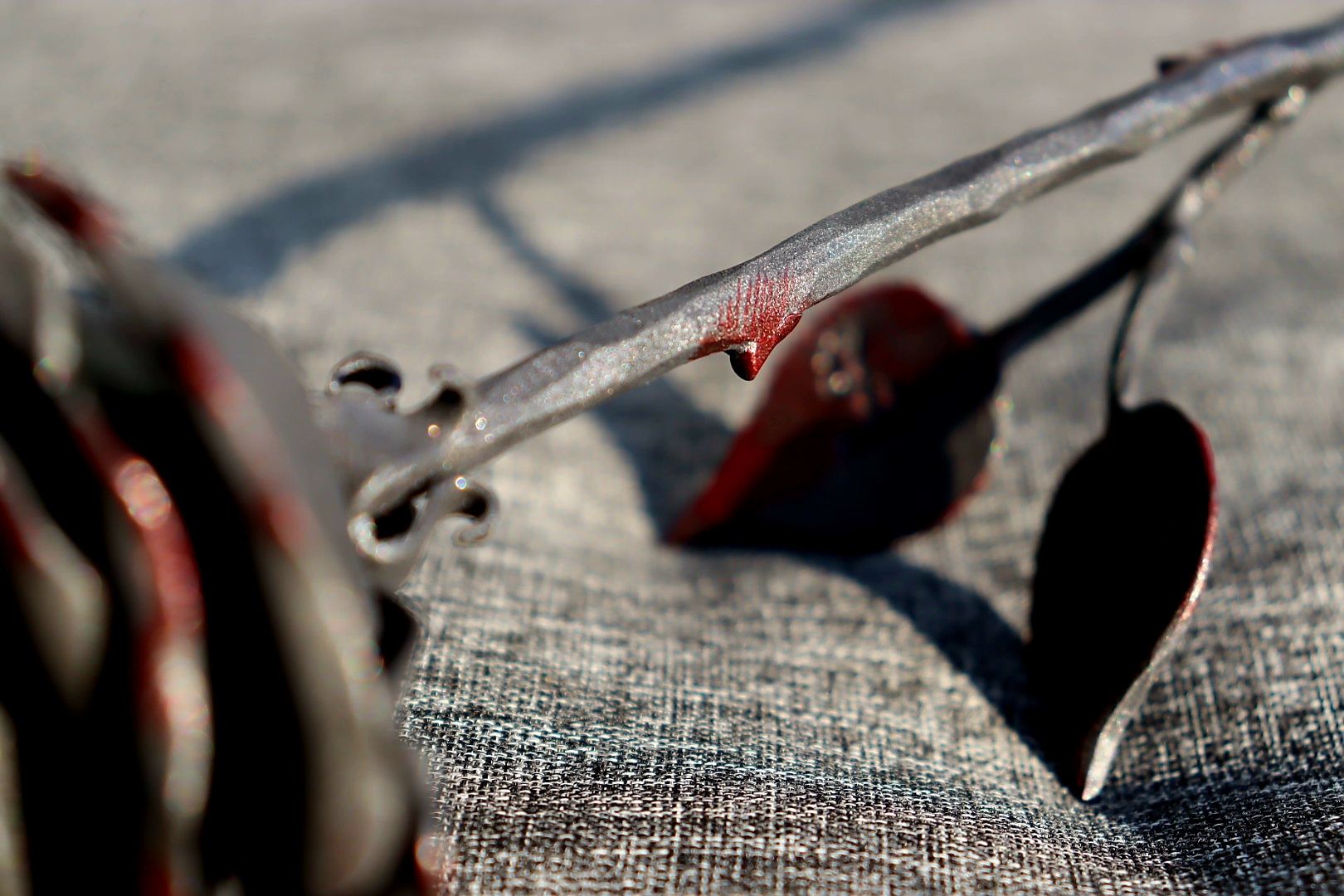 Ručně kovaná růže s tóny krvavé barvy včetně kovaných trnů.